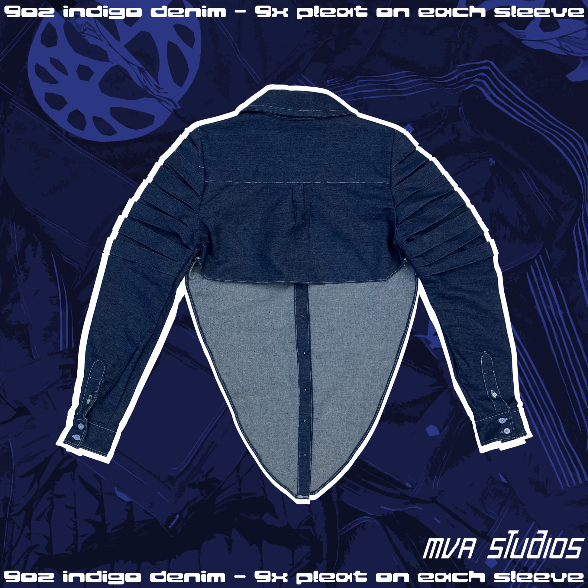 The Pleated Denim Pinstripe Shirt is made from 100% cotton 9oz medium weight indigo denim. The shirt features dtf printed pinstripes along the sleeves. It has 9 pleats on each sleeve and a navy overlock finish on all outer edges.